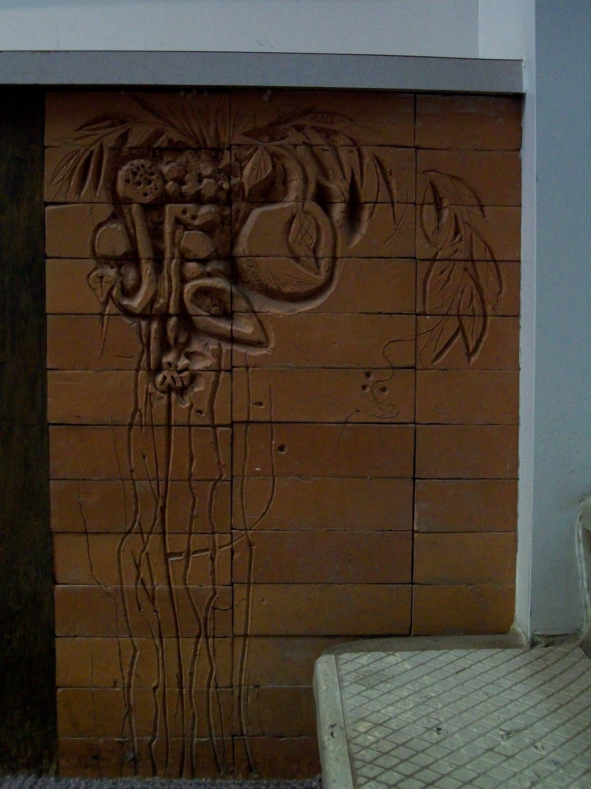 Marxhausen's office used to be located in Weller's basement. His office would be to the left if you walked down this hall, while the classroom would be to the right. Those glass cases displayed artwork by students. The rooms are now used for storage and were stripped bare of any artwork when Brommer became the art building. However, Marxhausen's scripture in brick remains along with this mural.